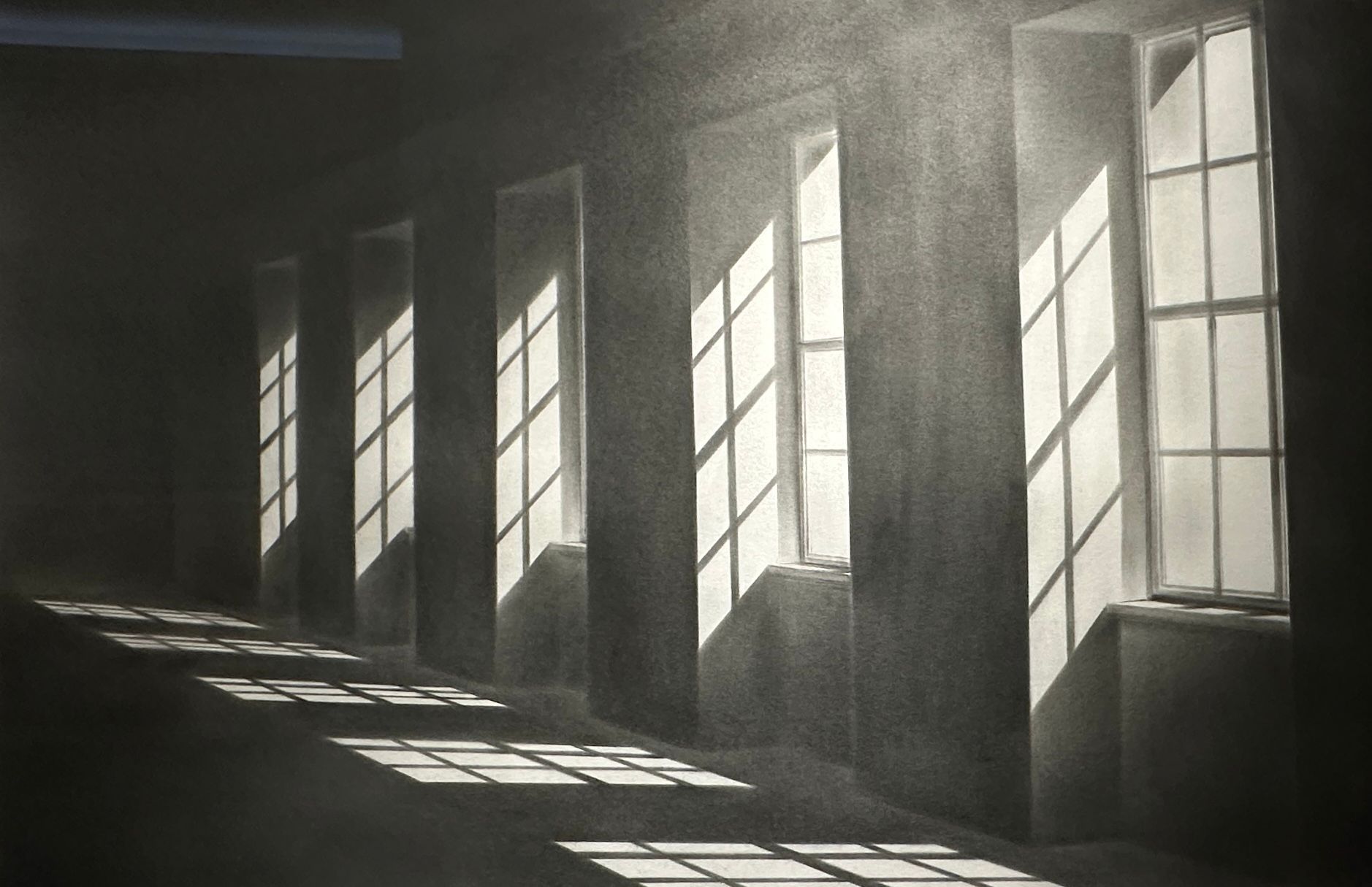 Simon Schubert doesn't draw with black. He removes light. His charcoal pieces, corridors, windows, curtains don't represent empty spaces. They represent what it feels like to be in one. Standing in front of a large format, windows in enfilade, I had the impression the light was about to shift. It didn't. But I waited.