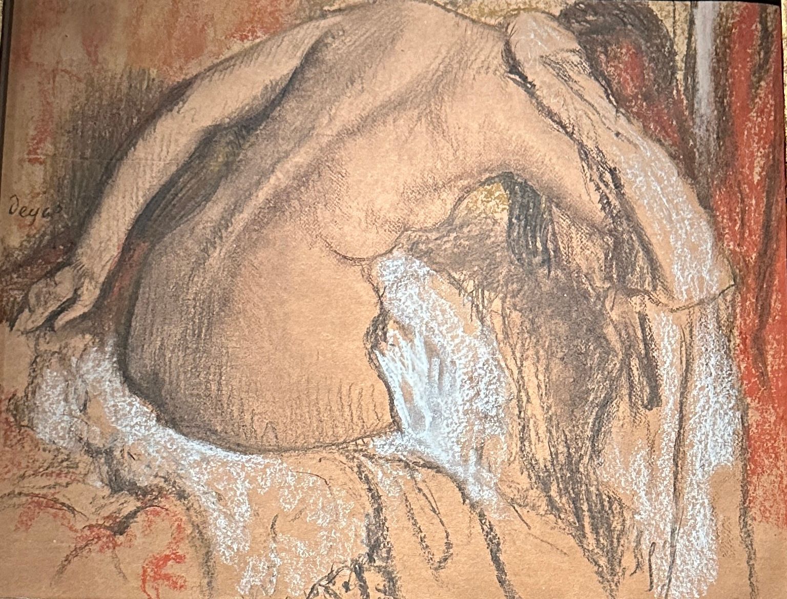 Degas ne peint pas les corps. Il peint ce qu'un corps fait quand personne ne regarde. Ce pastel d’ une femme après le bain, dos tourné, tête penchée n'est pas une pose. C'est un geste surpris. La chaleur du médium, les couleurs qui se fondent sans se résoudre. Rien n'est fini. Tout est juste. C'est ça que le dessin peut faire que la peinture ne fait pas toujours : rester proche.