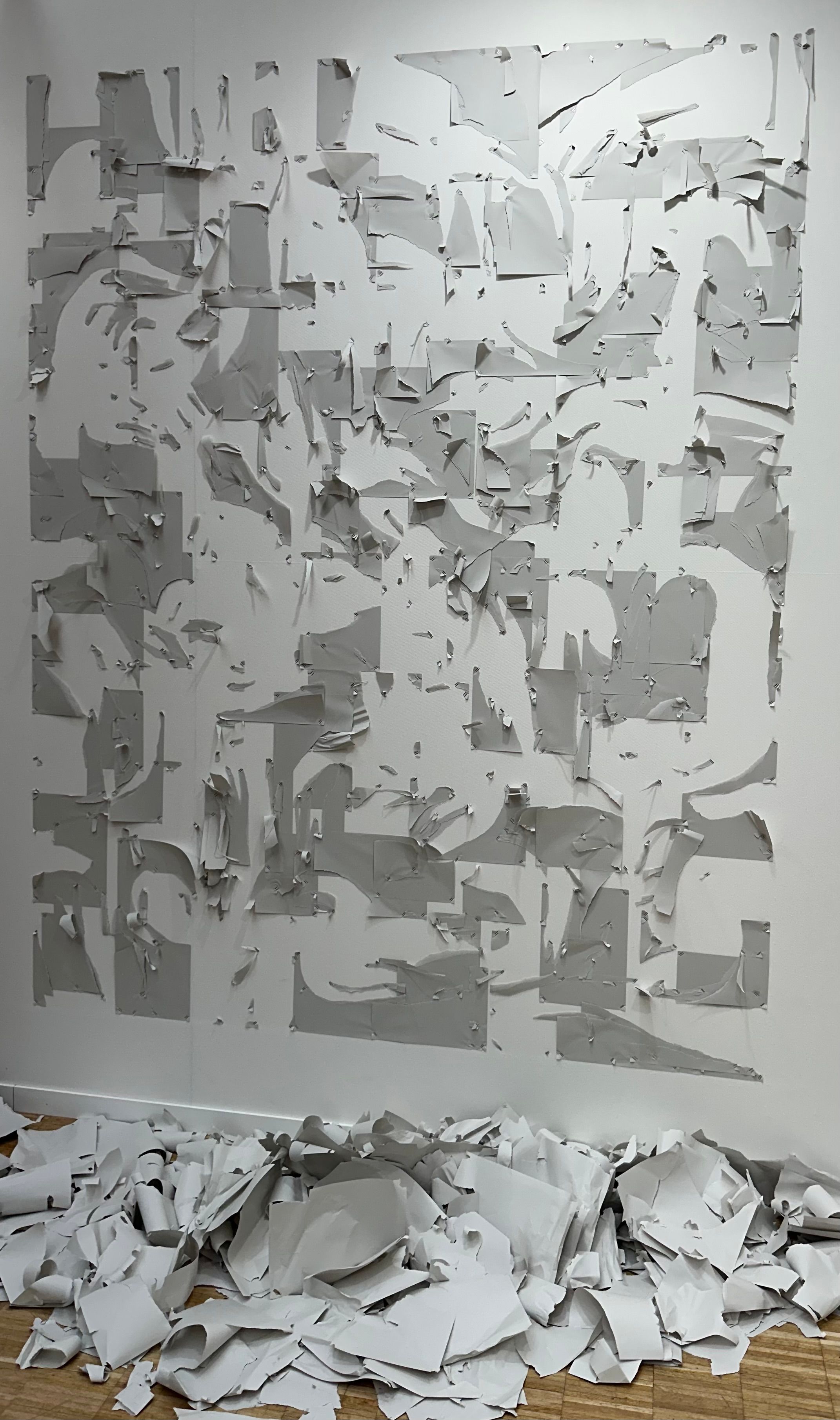 Guillermo Mora suspend des feuilles de papier découpées sur un mur. En bas, les chutes s'accumulent, l'œuvre en train de devenir ses propres restes. Rien n'est dissimulé. Le travail n'essaie pas de durer. Et c'est précisément cette honnêteté qui le rend présent.
